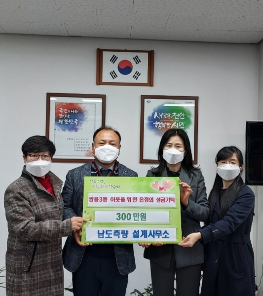 [충청뉴스큐] 천안시 쌍용3동은 지난 23일 남도측량설계사무소가 행정복지센터를 방문해 어려운 이웃을 돕기 위한 성금 300만원을 기탁했다고 밝혔다.