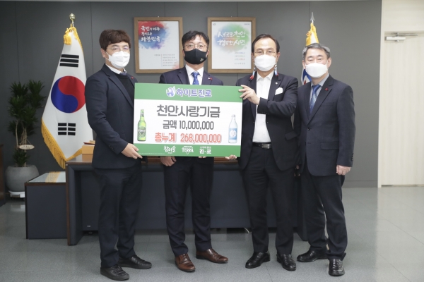 [충청뉴스큐] 하이트진로 천안지점은 지난 24일 천안시를 방문해 관내 어려운 가구 지원에 사용해 달라며 성금 1,000만원을 기부했다.