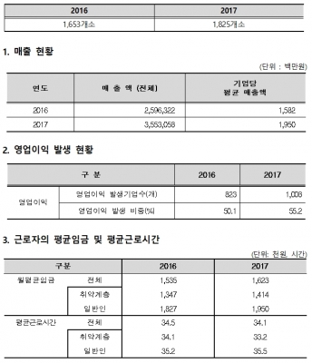 전체 영업이익은 177억9천만원이며, 영업이익 발생 기업 수는 1,008개소로 지난해 대비 5.1%p 증가했고, 기업 당 평균영업이익 또한 9백만원으로 지난해에 비하여 274.9% 증가하는 등 전반적인 경영실적이 나아졌다.