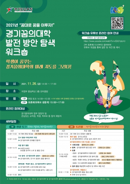 특히 2부 토론은 도민 대상으로 유튜브 경기꿈의대학을 통해 실시간으로 방송할 예정이다.