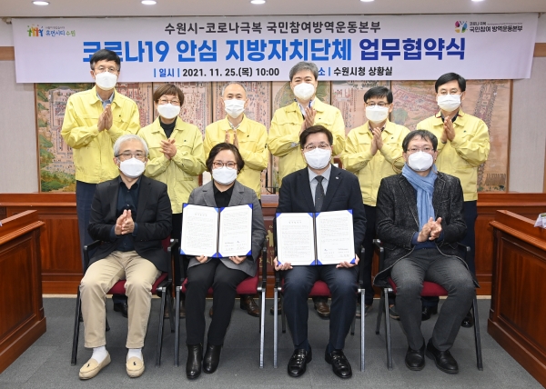 [충청뉴스큐] 수원시는 25일 시청 상황실에서 코로나극복 국민참여방역운동본부와 ‘코로나19 안심지방자치단체 업무협약’을 체결하고 시민 참여를 기반으로 한 지속가능한 방역체계 구축을 위해 협력하기로 했다.