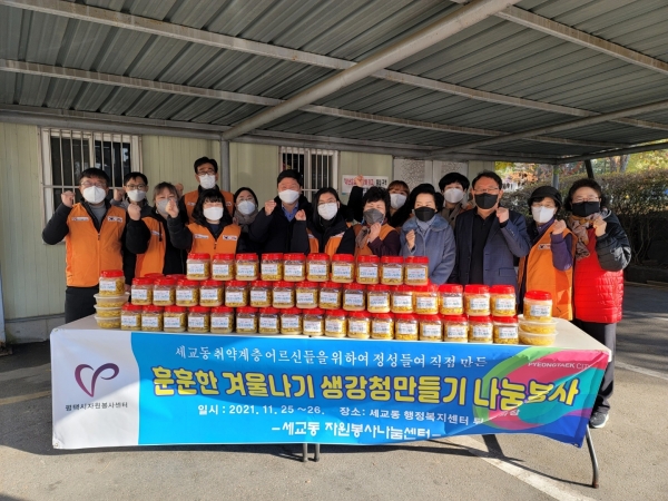 [충청뉴스큐] 평택시 세교동 자원봉사나눔센터는 지난 25일부터 26일 양일간 관내 독거노인 및 취약계층을 대상으로 생강청 나눔 행사를 실시했다.