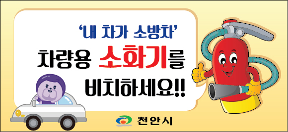 이에 현행법령 7인승 이상의 차량에 차량용 소화기를 의무적으로 비치하도록 제도화하고 있으나, 천안시는 전 시민의 안전을 위해 모든 차량에 차량용 소화기를 비치해주길 적극 독려하고 있다.