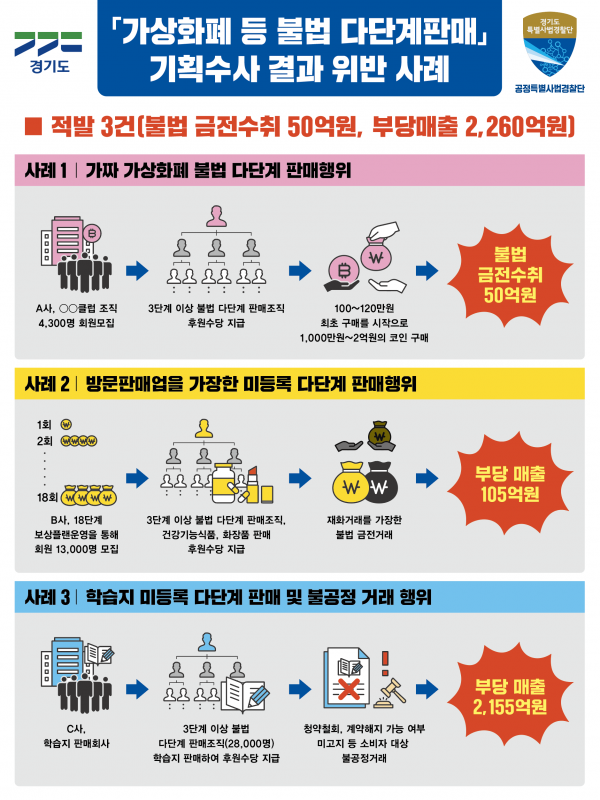 [충청뉴스큐] 미등록 다단계판매조직을 개설해 회비 명목으로 총 50억원 상당을 가로챈 가상화폐 판매업체와 고액의 후원수당을 미끼로 유사 다단계 조직을 운영한 방문판매업체 등이 경기도 수사에 적발됐다.