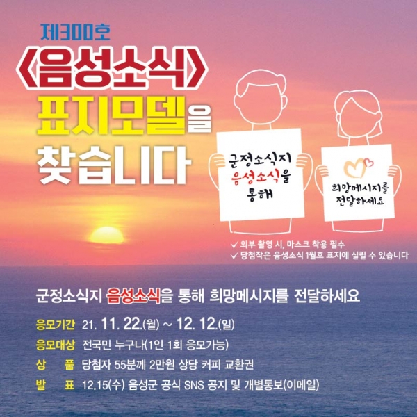 [충청뉴스큐] 충북 음성군이 전 국민을 대상으로 ‘음성소식’ 제300호 발행 기념 ‘SNS 희망메시지 이벤트’를 오는 12일까지 진행한다.