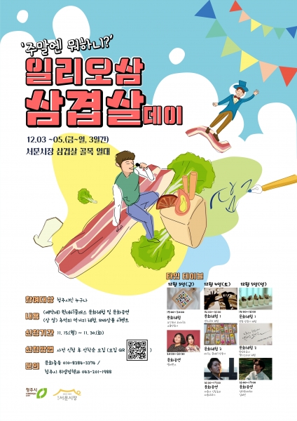 [충청뉴스큐] 청주의 대표음식인 삼겹살을 특화 조성한 서문시장 삼겹살거리에서 12월의 첫 주말인 3일부터 5일까지 3일간 ‘주말엔 뭐하니? 일리오삼 삼겹살데이’ 문화행사가 열린다.