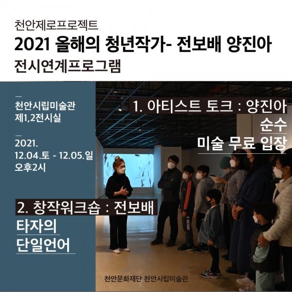[충청뉴스큐] 천안문화재단은 천안시립미술관이 ‘천안제로프로젝트 : 2021 올해의 청년작가-양진아·전보배’ 전시와 연계한 다양한 교육프로그램을 운영한다고 밝혔다.