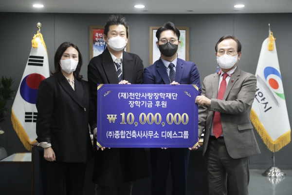 [충청뉴스큐] 주식회사 종합건축사사무소 디에스그룹이 지난 1일 천안시청을 방문해 지역 우수 인재 발굴 및 양성을 위한 장학기금 1,000만원을 천안사랑장학재단에 기부했다.