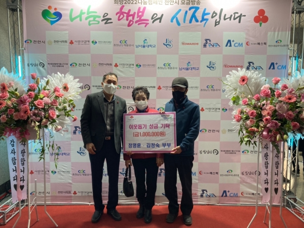 [충청뉴스큐] 천안시 입장면은 양대리 정명훈 노인회장과 김정숙 새마을부녀회장 부부가 지난 1일 이웃돕기 성금 100만원을 기탁했다고 밝혔다.