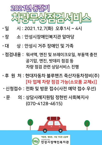 [충청뉴스큐] 안성시장애인복지관은 오는 12월 7일 오후 1시부터 4시까지 차량무상점검서비스를 진행할 예정이라고 밝혔다.