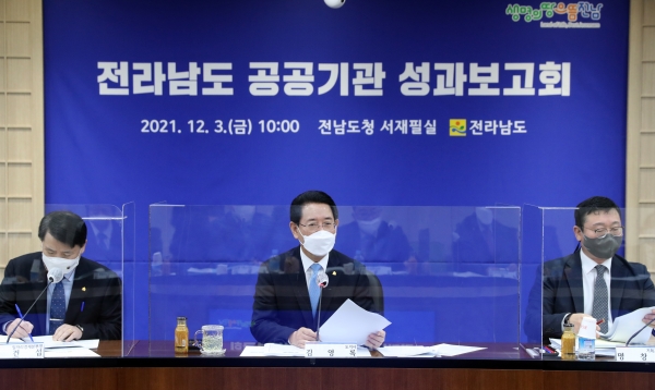 전남도는 3일 도청 서재필실에서 전남개발공사 등 도 산하 18개 공사·출연기관이 모여 김영록 지사 주재로 ‘전라남도 공공기관 성과보고회’를 개최했다.