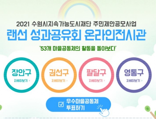 수원도시재단은 6~12일 7일간 수원시 주민들의 마을공동체 활동 성과를 홍보하고 격려하기 위한 ‘2021년 주민제안 통합공모사업 랜선 성과공유회’를 개최한다.
