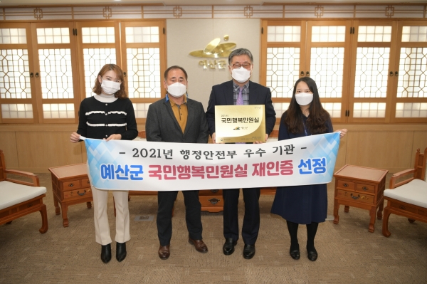 [충청뉴스큐] 예산군청 민원실이 행정안전부에서 주관하는 ‘2021년 국민행복민원실’로 재인증을 받았다.