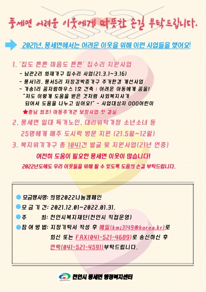 희망2022나눔캠페인은 풍세면행정복지센터를 방문 및 전화 또는 이메일을 통해 문의·참여할 수 있다.