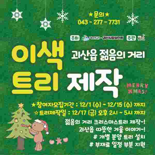[충청뉴스큐] 충북 괴산군은 오는 12월 17일 괴산읍 젊음의거리 일원에서 ‘2021 따뜻한 겨울이야기 트리 점등식 및 이색트리제작’ 행사를 개최한다.