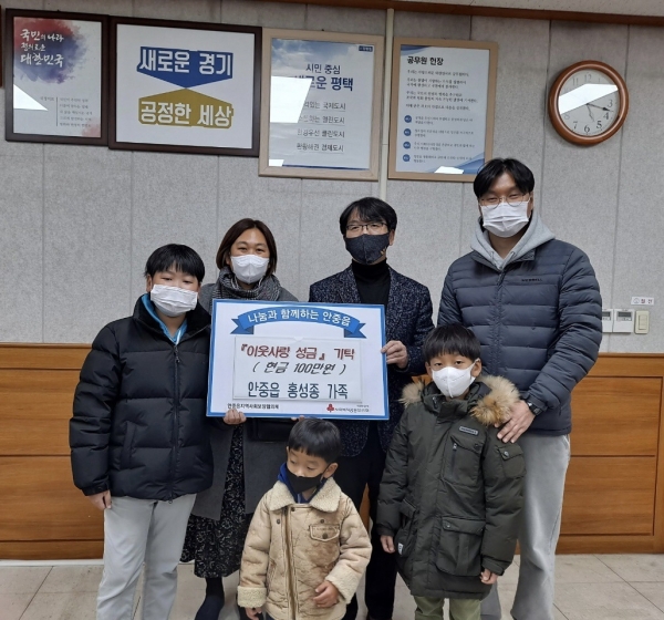 [충청뉴스큐] 평택시 안중읍 주민 홍성종씨 가족은 지난 2일 연말연시를 맞아 지역사회 내 어려운 이웃을 위해 모은 성금 100만원을 안중읍행정복지센터에 기탁했다.
