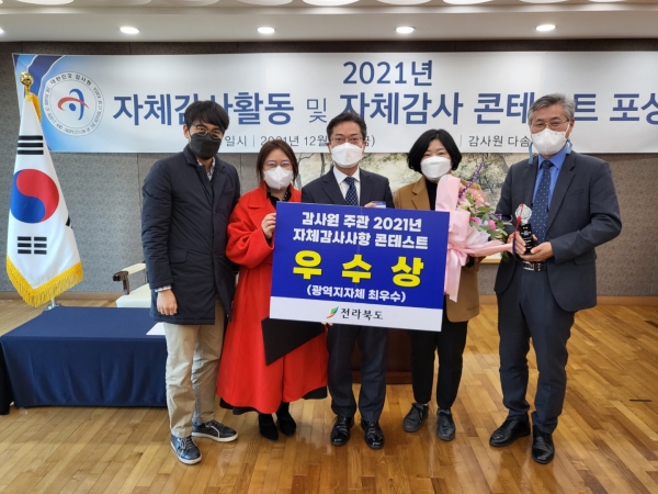 전라북도는 감사원이 지난 11월에 발표한 2021년 자체감사활동 평가 4년 연속 광역자치단체 최우수기관으로 선정된 데 이어 전국 667개 중앙부처, 자치단체, 공기업 등의 자체감사기구를 대상으로 실시는 ‘2021년 자체감사사항 콘테스트’에서 우수상을 수상했다고 밝혔다.