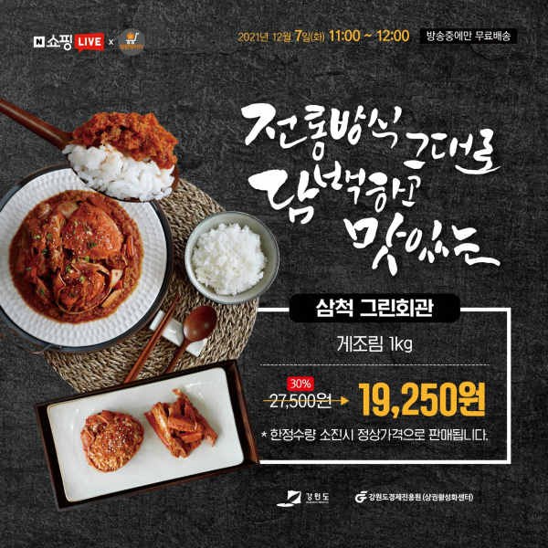 12월 7일 11시에는 ‘삼척 게조림’, 8일 11시에는 ‘태백 물닭갈비’를 판매하며 ‘네이버 쇼핑라이브’에서 ‘강원장터TV’를 검색해 라이브커머스 방송 중 구매하면 30%할인과 무료배송의 혜택을 받을 수 있다.