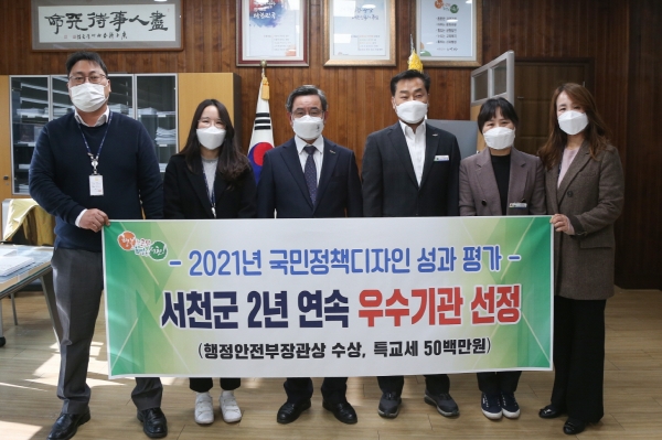 [충청뉴스큐] 서천군은 행정안전부 주관 2021년 국민정책디자인 성과평가에서 2년 연속 우수기관으로 선정돼 행정안전부 장관상을 받고 특별교부세 5천만원을 확보했다고 6일 밝혔다.