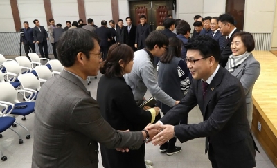 이날 시무식에 참석한 김원기 부의장은 신년사를 하고 신낭현 신임 의회사무처장을 비롯한 직원들과 일일이 악수를 하며 신년인사를 했다.