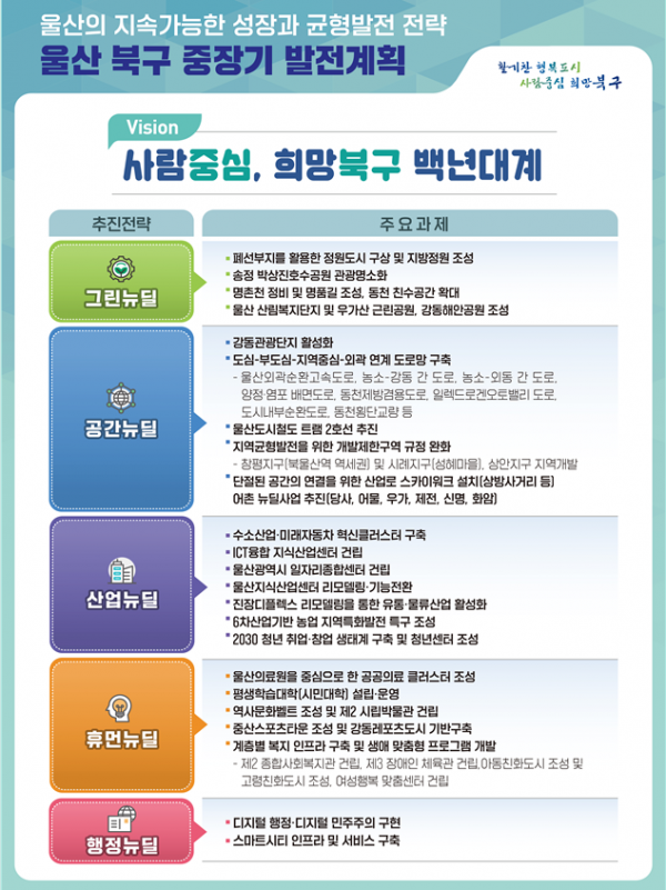 울산시 지원 핵심 선도사업은 북구 건의 과제를 중심으로 정원도시 조성과 지방정원 등록, 강동권역 해양관광 휴양도시 조성, 친환경 미래모빌리티산업 선도도시 구축, 북울산역 일원 광역 신성장거점 조성, 간선·순환도로 조기 준공과 교통망 개선 등 5건이다.