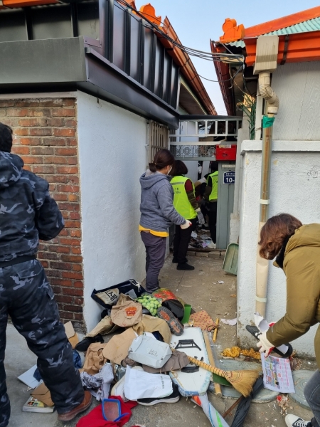 대상자는 노인부부세대로 집 입구에서부터 폐지, 헌옷, 가전제품 등 쓰레기를 쌓아놓아 집안으로 들어가려면 쓰레기 위로 넘어 다녀야 하는 위험한 상태이며 바퀴벌레 등으로 위생상태도 엉망으로 어르신들의 건강을 위협하고 이웃과의 갈등도 심한 상황이었다.