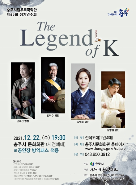 충주시립우륵국악단은 제65회 정기연주회 ‘The Legend of K’를 오는 12월 22일 오후 7시 30분 충주시문화회관에서 개최한다고 밝혔다.