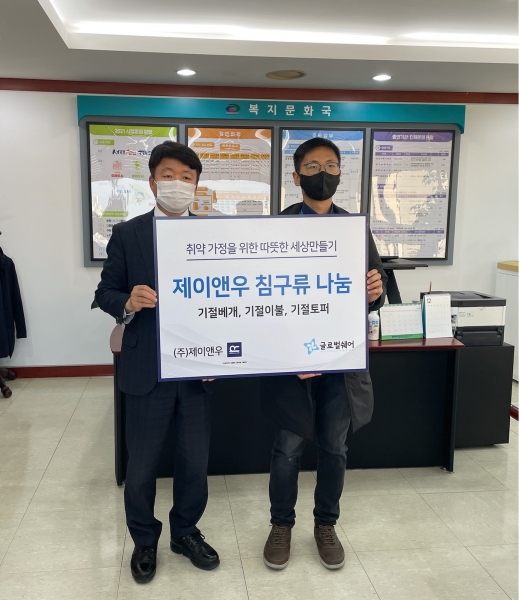 정영훈 ㈜제이앤우 대표와 고성훈 국제구호개발 NGO 글로벌쉐어 대표는 “이번 이불 나눔이 코로나19 등으로 어려움을 겪는 이웃의 따스한 겨울나기에 도움이 됐으면 한다”며 “앞으로도 더 많은 사회공헌 활동에 참여하도록 노력하겠다”고 말했다.