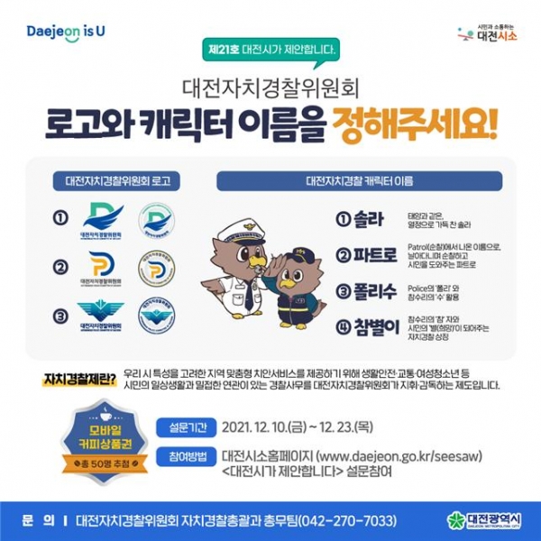 [충청뉴스큐] 대전광역시자치경찰위원회는 시민에게 더 친숙하게 더 가까이 다가가기 위해 제작한 로고와 캐릭터에 대해 시민의 의견을 묻기 위해 12월 10일부터 23일까지 설문조사를 실시한다고 밝혔다.