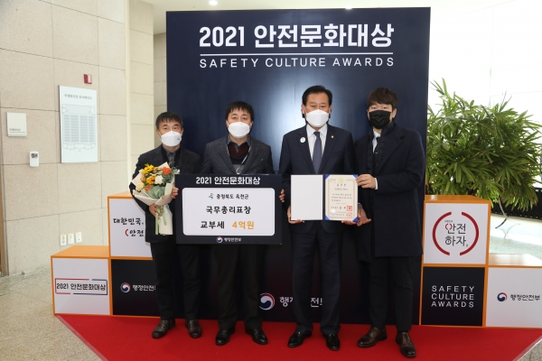 [충청뉴스큐] 충북 옥천군은 2021년 안전문화대상에서 안전문화 유공 분야 국무총리 표창을 수상해 특별교부세 4억원을 교부받는다고 밝혔다.