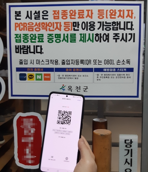 군은 의무적용 시설 이용객들이 영업소 입장 전 접종완료 증명서를 제시할 수 있도록 해당시설 입구에 부착할 접종완료증명서 제시 안내 스티커를 제작 배부하고 있다.