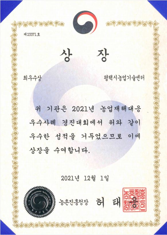평택시농업기술센터는 농업분야 재해대응을 위해 농작물재해대책 상황실, 병해충 예찰 방제협의회 및 방제단, 벼 이상저온에 따른 잔여모 알선 창구 등을 운영해 농가의 어려움을 신속하게 해결해, 농업인 피해발생을 최소화했으며 과수화상병 확산 예방을 위해 지난 7월22일 경기도 최초로 ‘과수화상병 사전방제조치 이행 행정명령’을 발령했고 발판소독매트 등 행정명령이행물품 6종 4천여 개를 농가에 신속히 공급해 과수화상병 대응에도 우수한 성과를 인정받아 최우수상의 영예를 안았다.