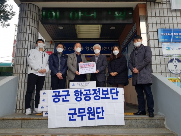 [충청뉴스큐] 공군항공정보단은 지난 9일 행복나눔 사랑의 이웃돕기 동참으로 평택시 신장2동행정복지센터에 백미 25포를 기탁했다.