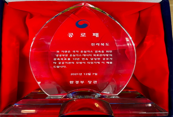 [충청뉴스큐] 전라북도가 공공부문 온실가스·에너지 목표관리제를 시행한 2011년부터 2020년까지 감축 목표를 10년 연속 달성한 기관으로 선정됐다.
