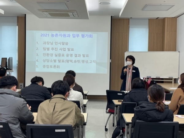[충청뉴스큐] 평택시농업기술센터 농촌자원과는 23명의 부서 직원들이 모인 가운데 지난 10일 농촌문화체험관에서 2021년 업무 추진 평가회를 실시했다.