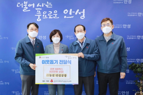 [충청뉴스큐] ㈜농심 안성공장은 지난 13일 안성시청을 방문해 이웃돕기 물품 라면 500상자를 기탁했다.