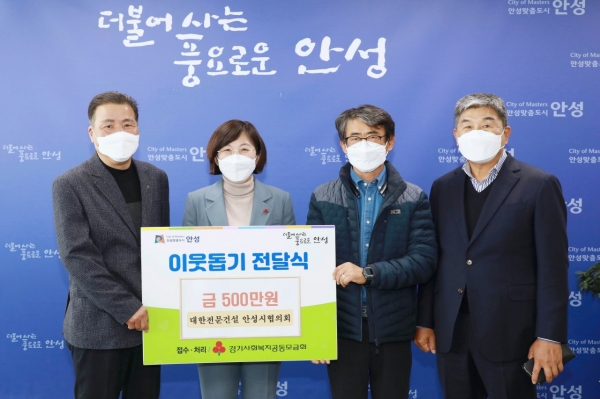 [충청뉴스큐] 대한전문건설협회 안성시협의회는 지난 13일 어려운 이웃을 위해 사용해달라며 이웃돕기 성금 500만원을 안성시에 기탁했다.