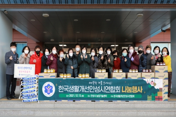 이순우 생활개선안성시연합회장은 “바른식생활지도사 1급 자격증을 취득하면서 회원들과 함께 이곳저곳 찾아가는 요리교실을 운영하고자 계획했었으나 코로나19로 사정이 여의치 않아, 요리에 활용하기 좋은 마늘고추장과 감기 예방에 좋은 유자청, 생강청 전달로 아쉬움을 대신했다”며 “사회적 거리두기와 온라인 소통으로 사람이 그리운 소외된 이웃들이 조금이라도 더 따뜻한 겨울을 날 수 있도록 이번 행사가 도움이 됐길 바란다”고 말했다.
