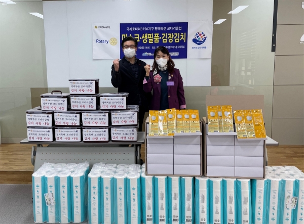 [충청뉴스큐] 국제로타리 3750지구 평택목련로타리클럽은 최근 평택행복나눔본부에 마스크·생필품·김장김치를 전달했다.