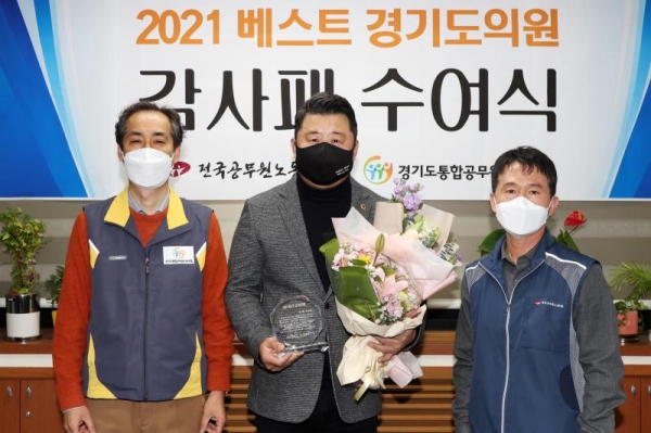 ‘베스트 경기도의원’은 정치, 사회, 문화 등 의정활동 전반에서 투철한 사명감과 모범적인 의정활동으로 귀감이 된 도의원을 전국공무원노조 경기도청지부와 경기도통합공무원노조가 공동으로 주관해 직원들의 투표를 통해 선정해 매년 감사패를 수여해오고 있다.