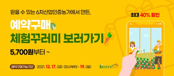 [충청뉴스큐] 경기도농수산진흥원이 운영하는 경기농촌융복합산업지원센터가 12월 17일부터 19일까지 3일간 도 농수산물 온라인몰 ‘마켓경기’에서 경기6차산업 인증을 받은 ‘농촌체험꾸러미 예약판매’ 할인 행사를 연다.