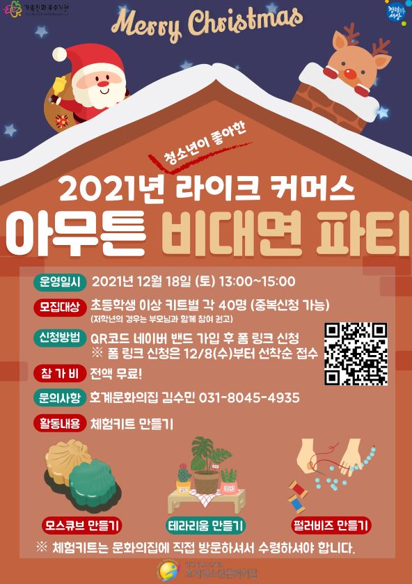 이번 행사는 비대면으로 안전하게 축제를 즐길 수 있도록 마련된 호계청소년문화의집의 연말파티로 소비자가 좋아요를 누르는 데서 구매가 시작되는 차세대 유통시장을 뜻하는 ‘라이크 커머스’를 바탕으로 2021년에 진행된 활동 키트 중 일부를 선별한 체험키트가 준비될 예정이다.