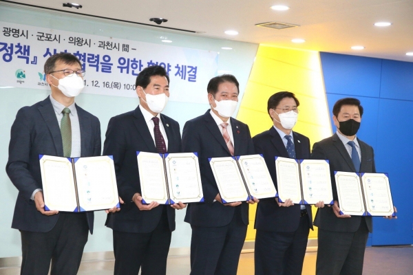 안양시는 16일 시청사 상황실에서 최대호 안양시장·박승원 광명시장·한대희 군포시장·김상돈 의왕시장·공정식 과천시부시장이‘안양천 수질관리정책 상호협력 협약을 체결했다고 밝혔다.
