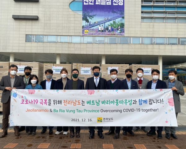 전남도는 16일 도청사 앞에서 베트남 껀터시, 바리아붕따우성에 보낼 코로나19 구호물품 발송식을 가졌다.