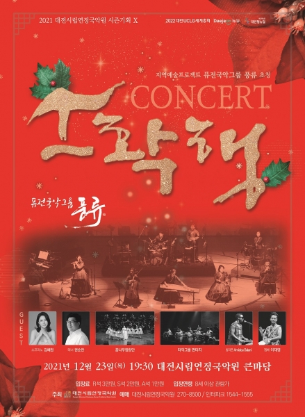 [충청뉴스큐] 대전시립연정국악원이 2021 시즌 기획Ⅹ 지역예술프로젝트 ‘퓨전국악그룹‘풍류’초청‘콘서트 소확행’공연을 오는 12월 23일 오후 7시 30분 대전시립연정국악원 큰마당에서 개최한다.