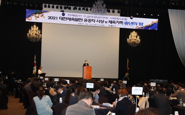 이날 행사는 2021 대전체육 주요성과 홍보영상 시청, 전국대회성적우수자 격려금 전달, 대전체육발전 유공자 시상, 인사말 및 축사, 체육상 시상, 감사패 수여, 2027하계세계대학경기대회유치기원 퍼포먼스, 기념촬영 및 폐회 순으로 진행됐다.