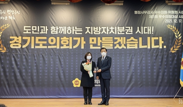 [충청뉴스큐] 경기도의회 교육기획위원회 김은주 의원은 17일 경기도의회 대회의실에서 열린 ‘2021년 경기도의회 의원 종무식’에서 2021년 행정사무감사를 빛낸 우수의원으로 선정됐다.
