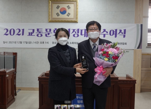 [충청뉴스큐] 경기도의회 건설교통위원회 조광희 도의원은 17일 경기도의회 소회의실에서 개최된 한국선진교통문화 연합회으로부터 경기도 교통환경개선과 교통문화 선진화에 기여한 공을 인정받아 ‘2021 교통문화의정대상’을 수상했다.