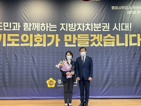 [충청뉴스큐] 경기도의회 경제노동위원회 심민자 의원이 17일 경기도의회 대회의실에서 개최된 종무식에서 ‘제11회 대한민국시도의회의장협의회 우수의정대상’을 수상했다.
