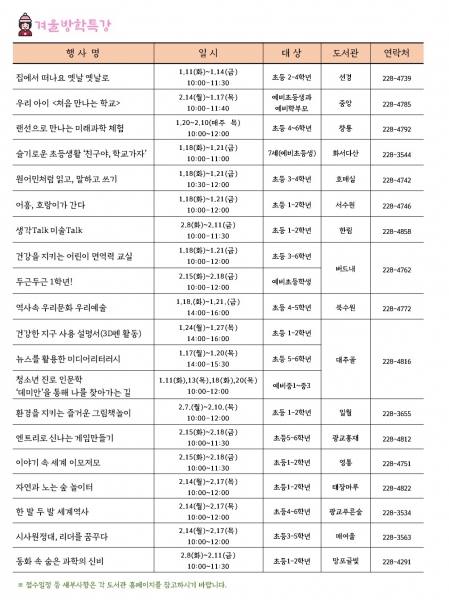 겨울방학 특강은 독서와 연계해 초등학생 자신감을 높이는 교육 ‘우리 아이 처음 만나는 학교 세계 각국의 다양한 전통문화를 알아보는 ‘이야기 속 세계 이모저모’ 2022년 임인년을 맞아 호랑이 그림책을 읽고 책을 만들어보는 ‘어흥, 호랑이가 간다’ 등 20개 프로그램이 운영된다.